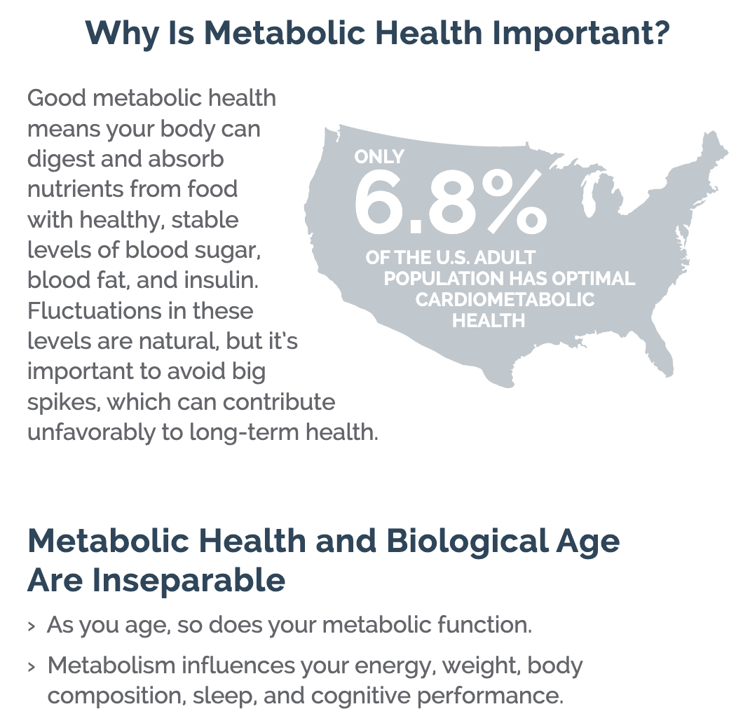 As you can see in the graphic, very few U.S. adults (and it would be a similar profile for Canadians) have optimal cardio-metabolic health. Our metabolic health influences: energy, weight, sleep, mood, clarity and stress levels. The most successful approach to anti-aging is to optimize your metabolic health.